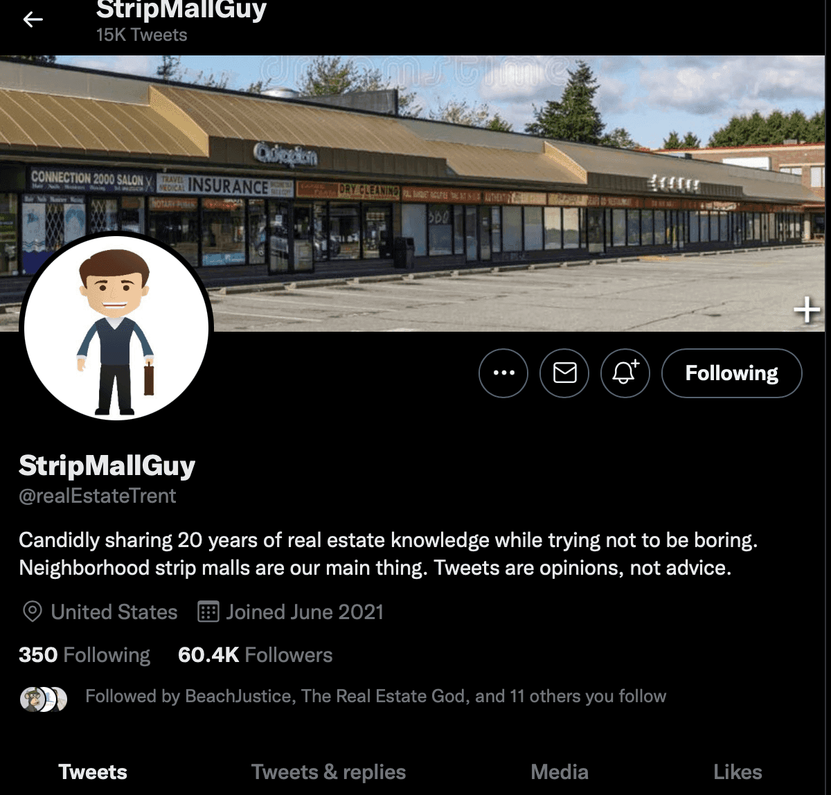 Similar to our friend Keith, the StipMallGuy is another common face within real estate Twitter. As you can see from his bio, he's got over 20 years of experience in the game and has some insightful tips, tricks, and understanding of how to run a successful real estate empire. The difference between him and others on our list is that this guy focuses mainly on strip malls which are commonly overlooked by investors. A strip mall can typically rake in a few hundred thousand dollars per year with rent payments and parking fees.