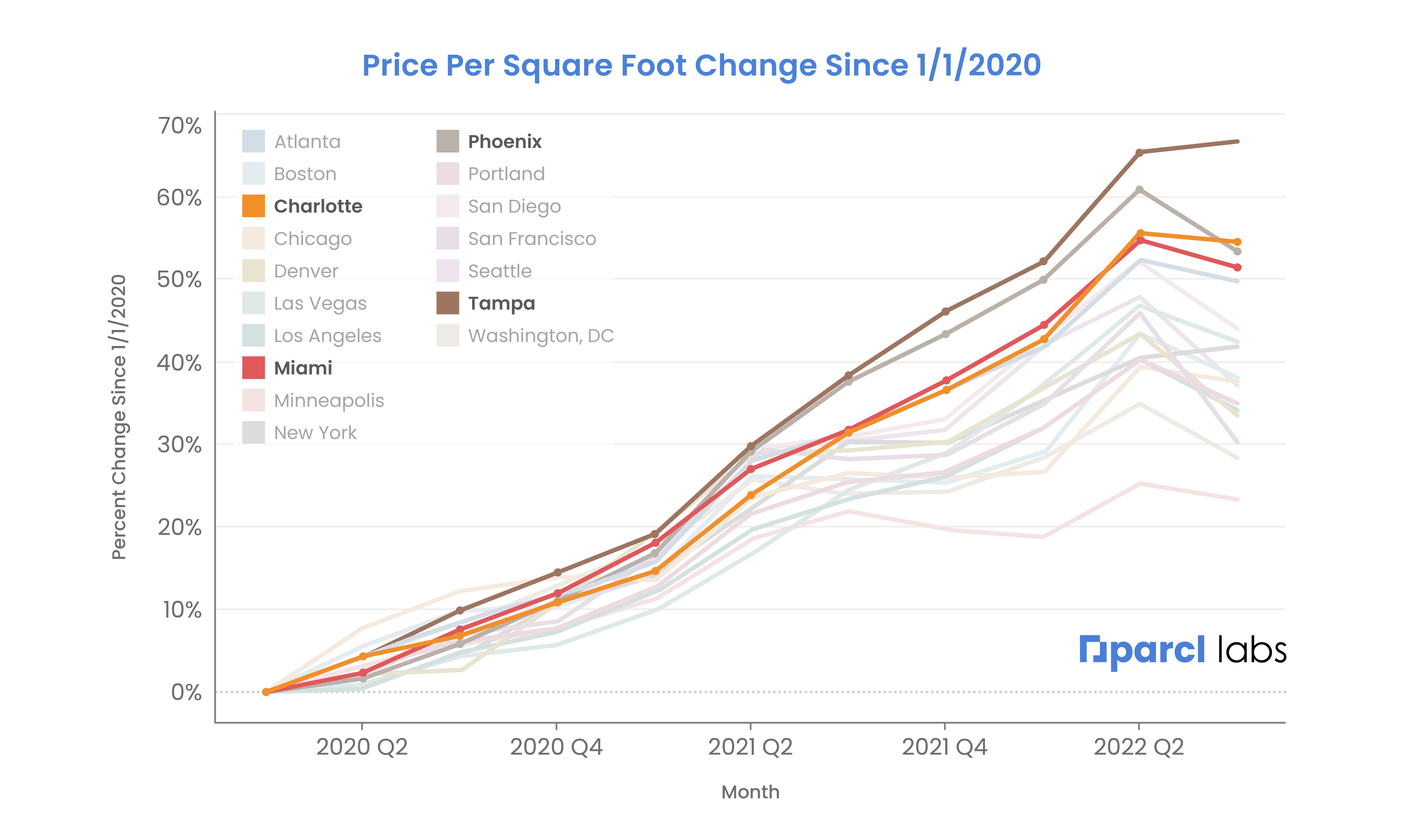 In that vein, we wanted to explore where the COVID real estate winners stood with respect to price performance and what a drawdown could look like should they retrace their COVID gains. Using Parcl Labs data, we explored the four largest COVID winners within the top 20 MSAs in the USA; Tampa, Miami, Phoenix, and Charlotte. On average, these cities were up ~60% from 2020 and peaked in 2Q22. While the market price per square foot in these cities has been somewhat resilient in recent months, its starting to decline at a faster pace in recent weeks.