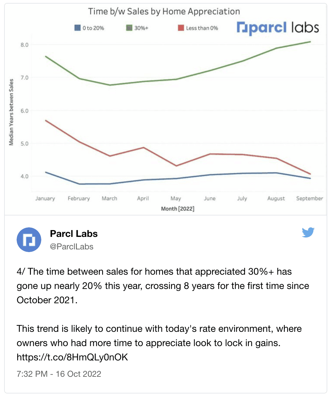 Some good news? We see reason to be optimistic for a soft landing in real estate - however, the magnitude of how soft is unclear. The reasons for this optimism are nuanced. Over the last 10 years, the average mortgage rate has stayed within a tight range of about 3% to 4%; we’ll call the people that pay this rate on their mortgage “the 3 percenters”. Within just four months, mortgage rates are now 7%+ - we’ll call the people that obtain this new rate “the 7 percenters”. 3 percenters have very little incentive to sell their homes, as any new home would come with a much higher mortgage payment. In short, 3 percenters shouldn’t want to become 7 percenters. Unless, of course, realized gains can comfortably offset the much higher monthly payment. Note that we are beginning to see high appreciation (i.e. well in the money) inventory come on line - most notably from owners that purchased over 8 years ago. This high appreciation inventory is currently driving the bulk of sales in the market. Parcl Labs recently tweeted about this dynamic