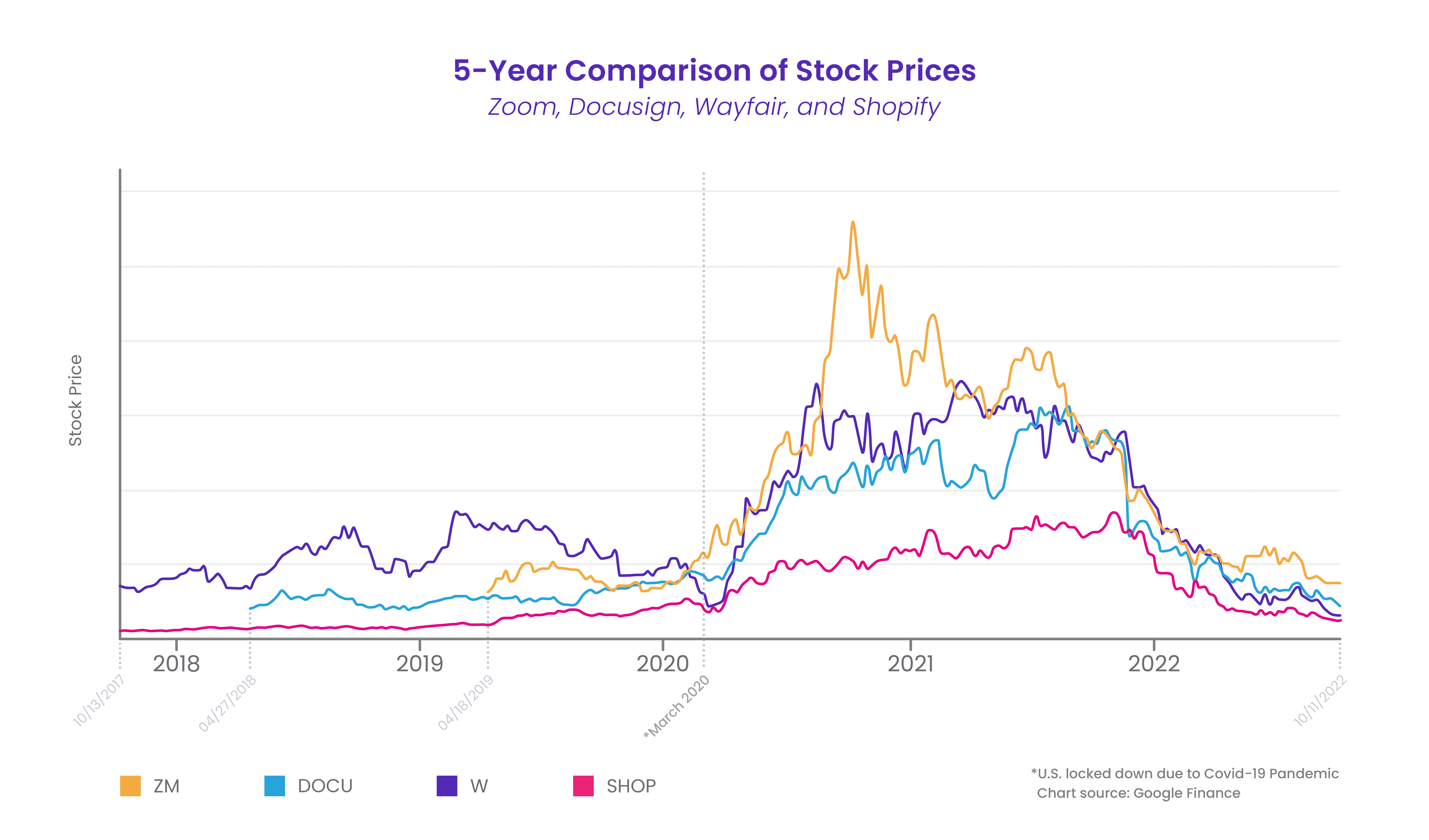 In the below chart, we look at the five-year stock performance of what we view as four key COVID winners: Zoom (video conferencing), Docusign (digital signature), Wayfair (affordable home furniture), and Shopify (e-commerce). Each has completely retraced all gains from COVID (March 2020) even though at least some portion of consumer behavior is permanently changed.