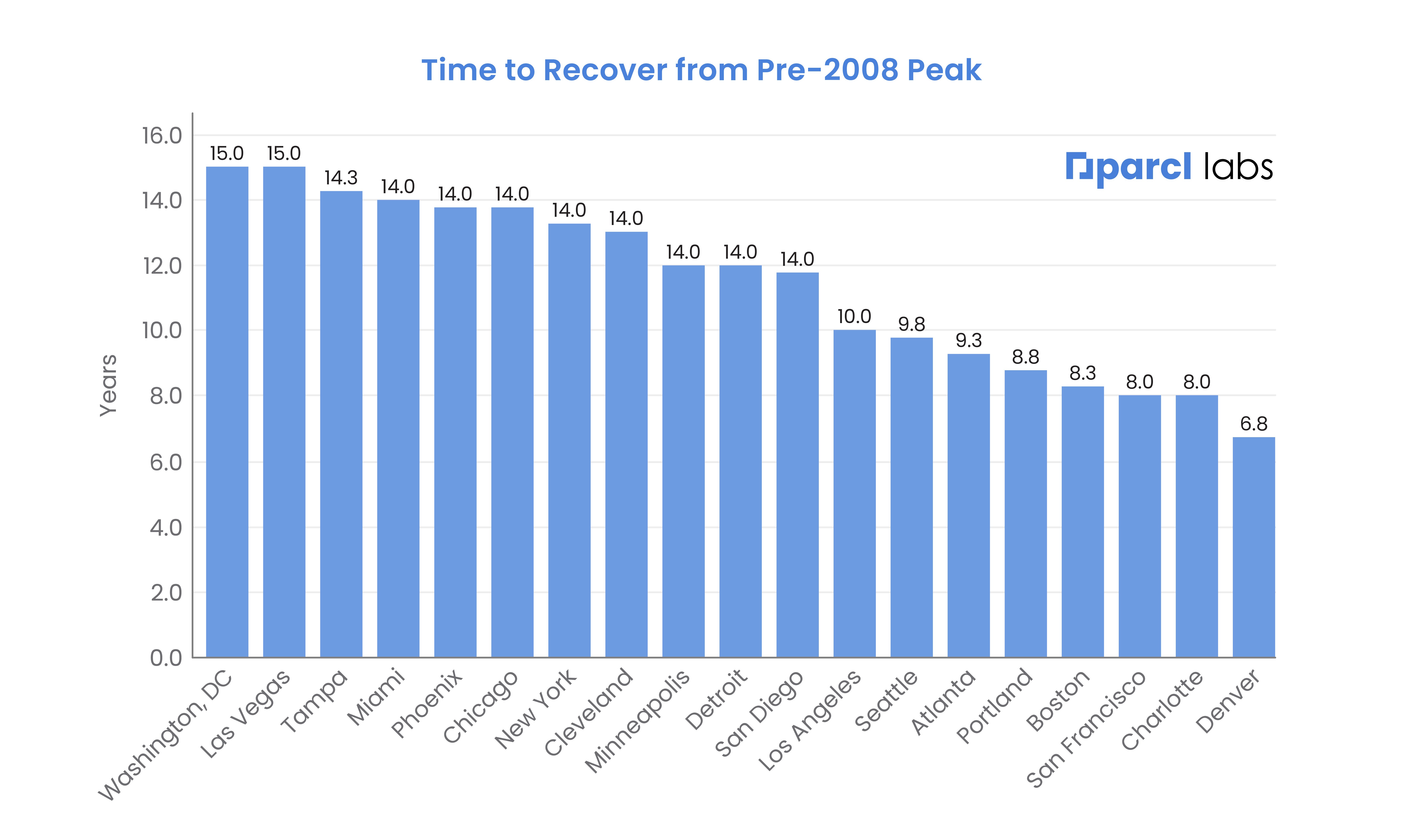 Generally speaking, sharp downside price movements happen quickly and can be violent. Recoveries can take much longer. In the chart below, we show how long its taken to get back to pre-2008 levels. In many instances, these markets have just reclaimed their prior peak (not unlike technology stocks post 2000) - and if adjusting for inflation many of these cities haven’t recovered at all.