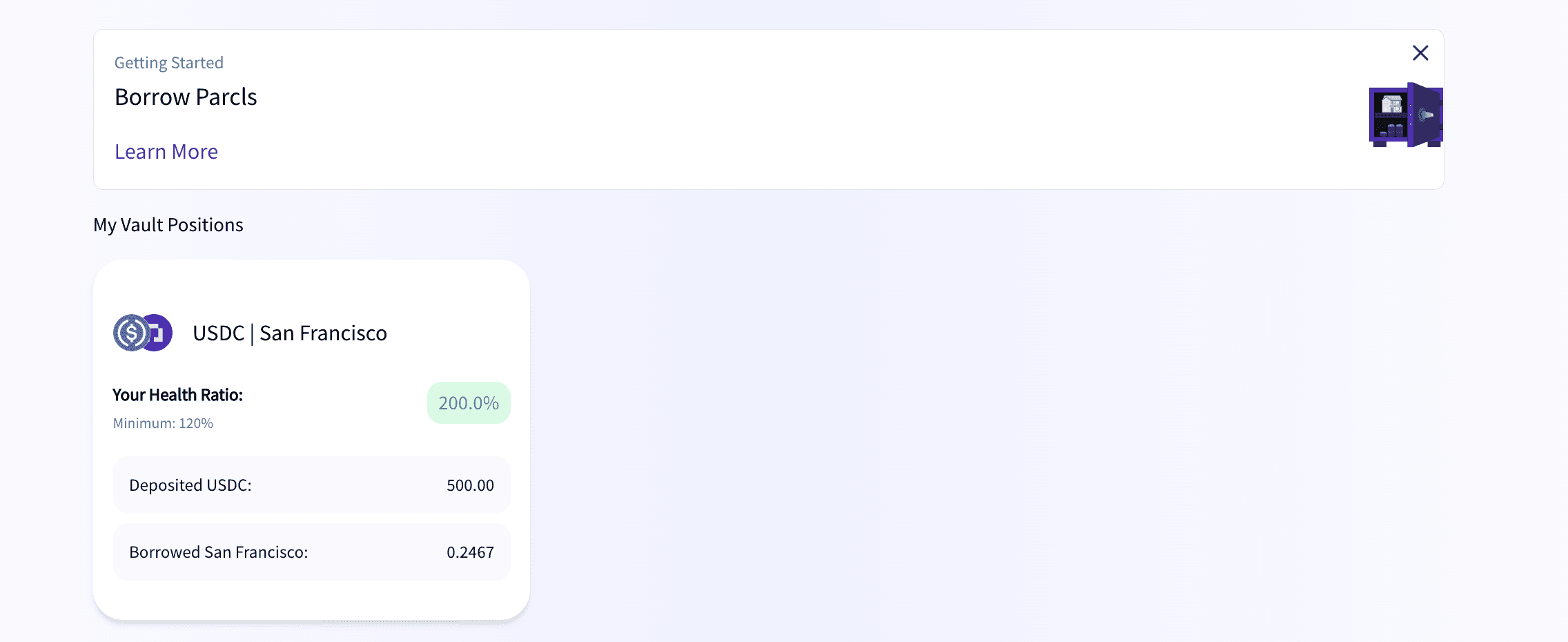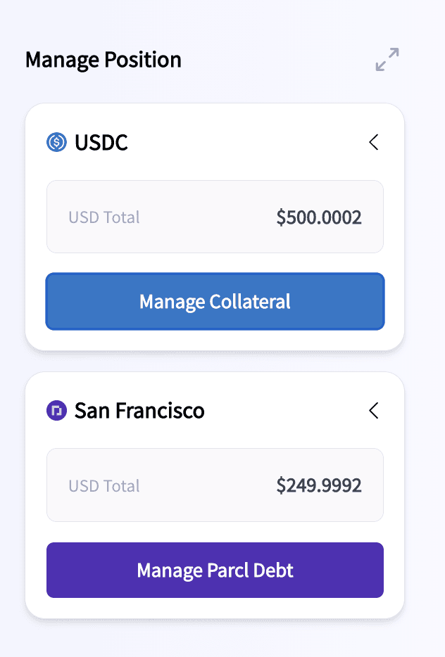The Manage Vault Positions page is designed so you can easily manage your existing vault position. Whether you want to borrow more tokens, deposit more collateral, or withdraw collateral when paying down your Parcl token debt it’s as easy as just a few clicks.