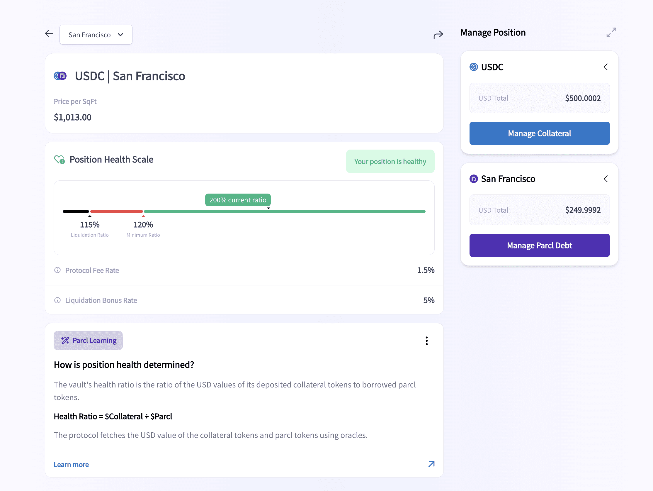 The Parcl Protocol Borrow feature allows you to borrow Parcls based on your deposited USDC collateral. If you have USDC and would like to get exposure to the real estate markets using Parcl, the Borrow feature is for you.