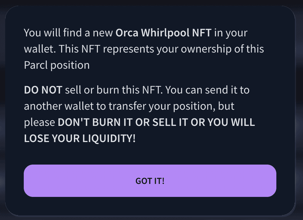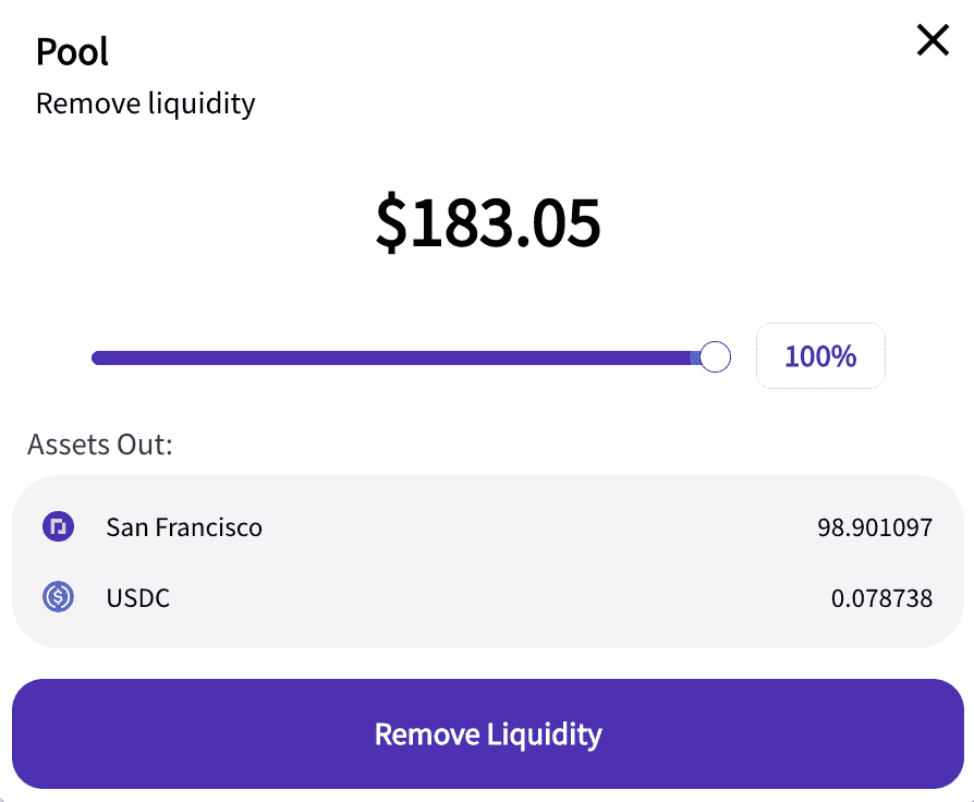 In this transaction, there is $100 USDC and .078896 Parcls of San Fransisco. Again, when providing liquidity, you’ll need roughly the same amount of each asset (USDC + San Fransisco, CA Parcl)