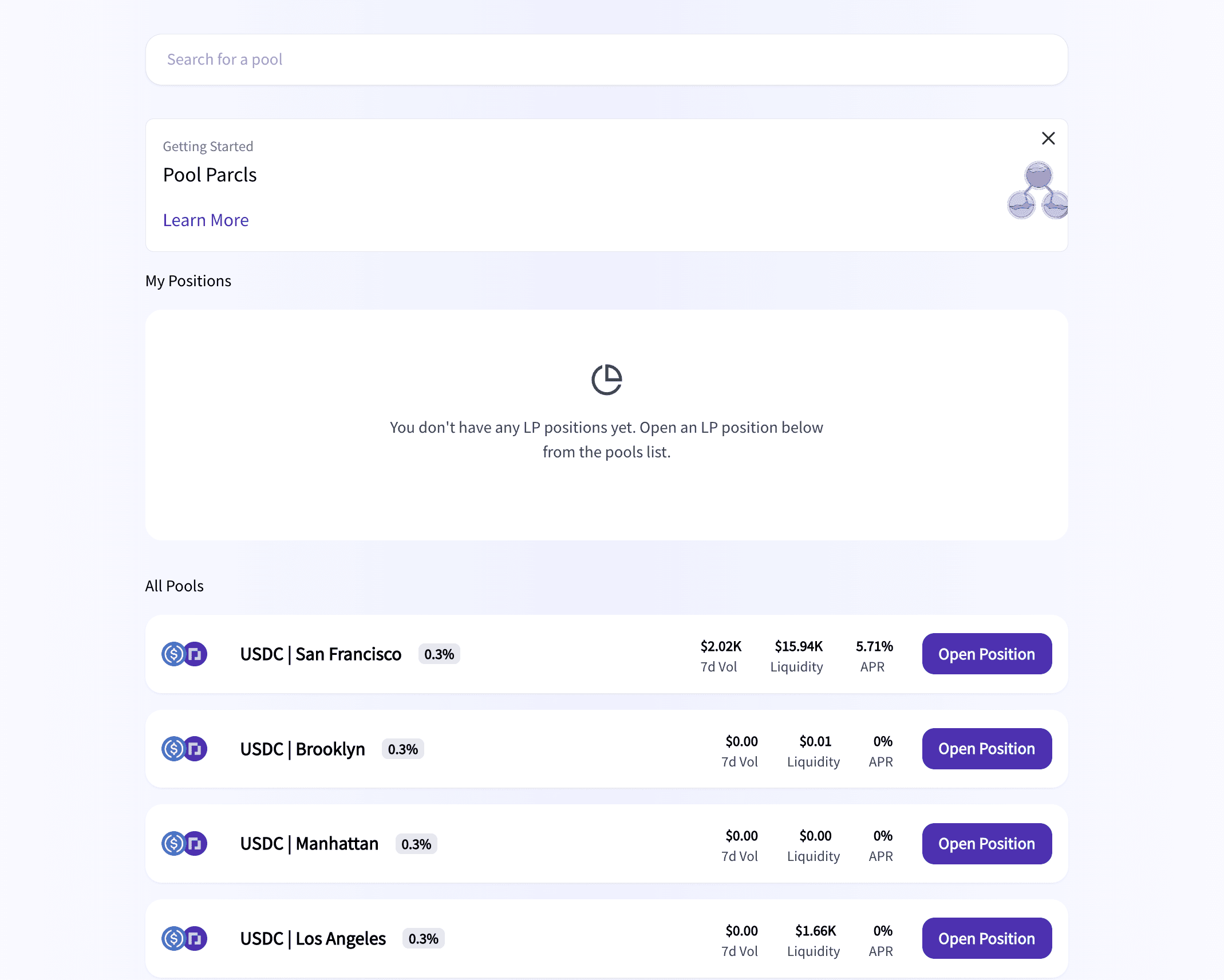 In order to use the Parcl Protocol Pool feature, you’ll first need to purchase Parcls of your favorite neighborhood and cities using the Parcl Protocol Trade feature.