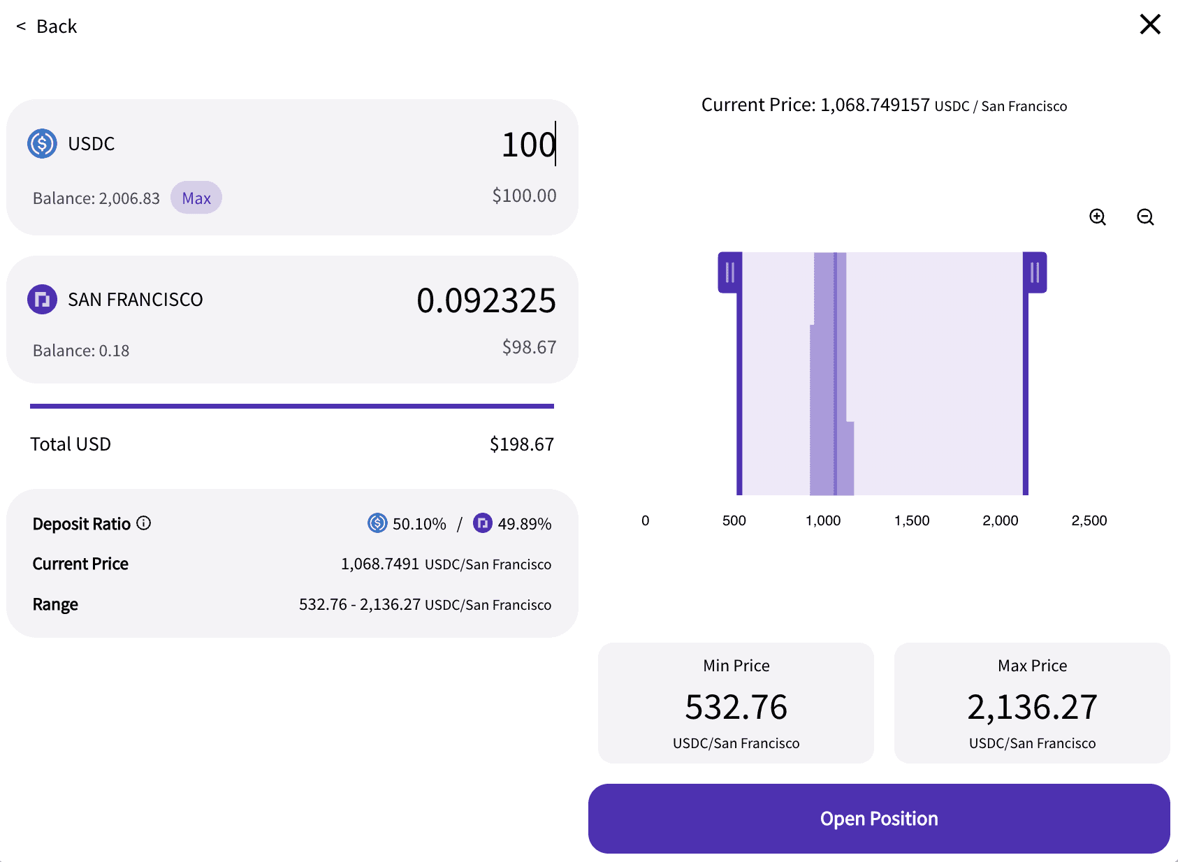 Before opening your position, you can see the Deposit Ratio, Current Price, and the Price Range. The Deposit Ratio refers to the ratio of USDC / Parcls based on the current price and positions of your boundaries.