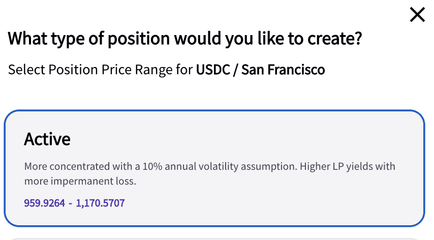 This option is great for those looking to be active in monitoring real estate prices and checking in on their Parcl Protocol Portfolio daily. This price range is more concentrated with a 10% annual volatility assumption. Active allows for higher potential LP yields, but has an increased possibility of impermanent loss.