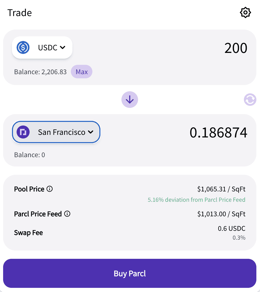 In this example, there’s a trade of 200 USDC for a .186874 stake of 1 San Francisco, Parcl. A unit of 1 (one) Parcl represents exposure to 1 sq ft of that location.
