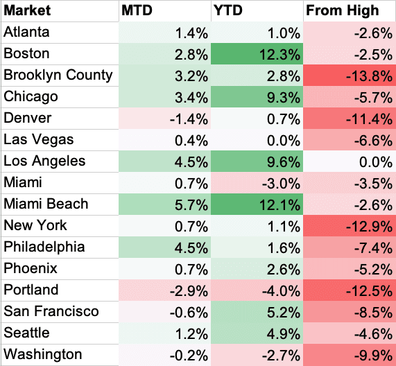 Some markets - such as Miami Beach (+5.7% MTD, +12.1% YTD, down 2.6% from peak), Los Angeles (+4.5%, +9.6%, all time high), Chicago (+3.4%, +9.3%, -5.7%), and Boston (+2.8%, +12.3%, -2.5%) - have risen at a more significant pace. Laggards are San Francisco (-0.6%, +5.2%, -8.5%), Portland (-2.9%, -4.0%, -12.5%), and Denver (-1.4%, +0.7%, -11.4%); all are down MTD.