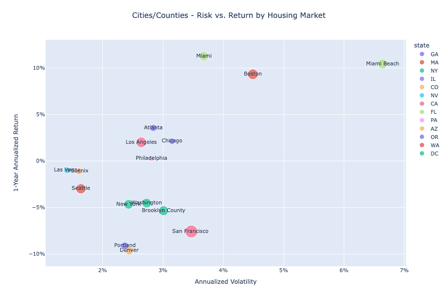 Miami and Boston continue to screen as top performers on a risk-adjusted basis. Portland, Denver, and San Francisco screen as the worst performers.