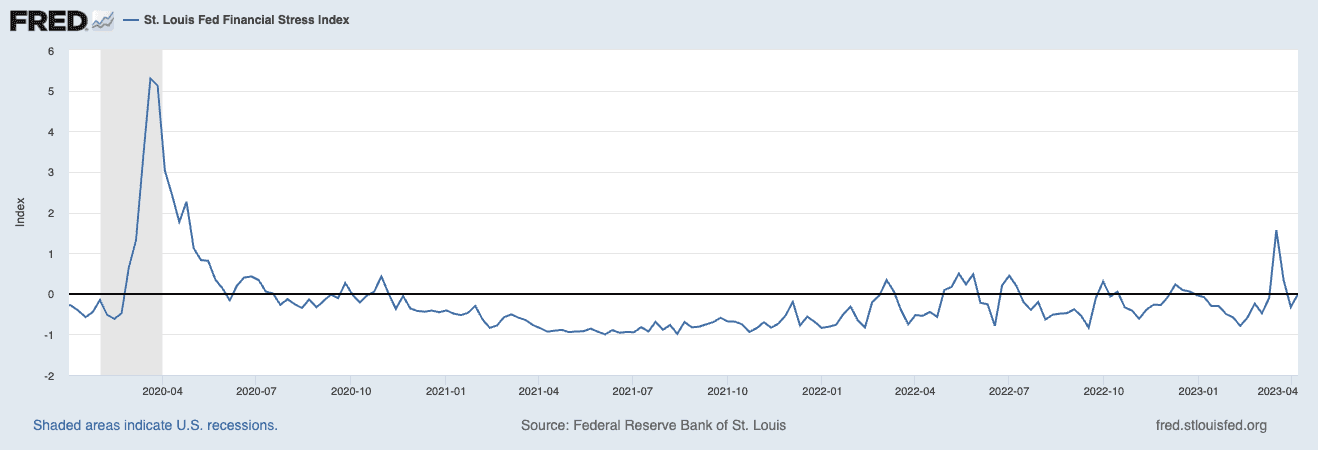 Volatility across markets has generally receded following a recent spike around bank solvency concerns as evidenced by the VIX Index and St. Louis Fed Financial Stress Index (shown below). This has led to a stabilization in risk appetite, though both treasury yields and equity markets are approximately flat MTD.