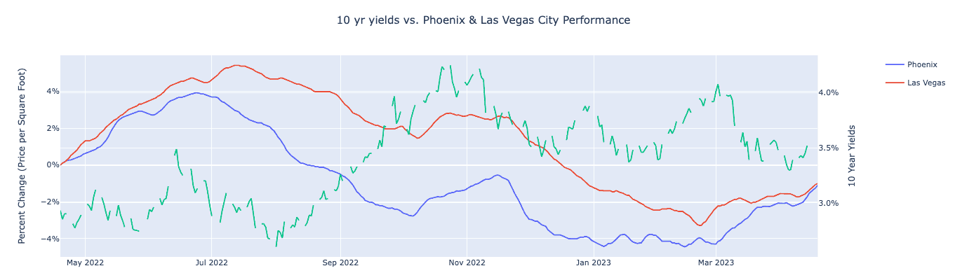 On the other hand treasury yields continue to exhibit elevated realized volatility, which has an impact on myriad downstream elements, such as mortgage rates and demand for housing. Phoenix and Las Vegas are two regional real estate markets that exhibit among the highest negative correlations to real time changes in interest rates.