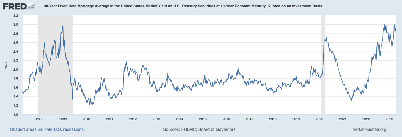 The spread between 30 year mortgage rates and the 10 year U.S. Treasury yield remains historically wide, However. Should this spread mean revert, it could perhaps create an additional tailwind for residential real estate demand near term.