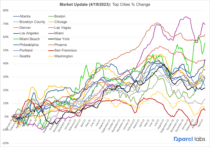 This blog update from April 19th 2023 covers the state of real estate prices in various markets, what's driving them, and what Parcl traders are doing.