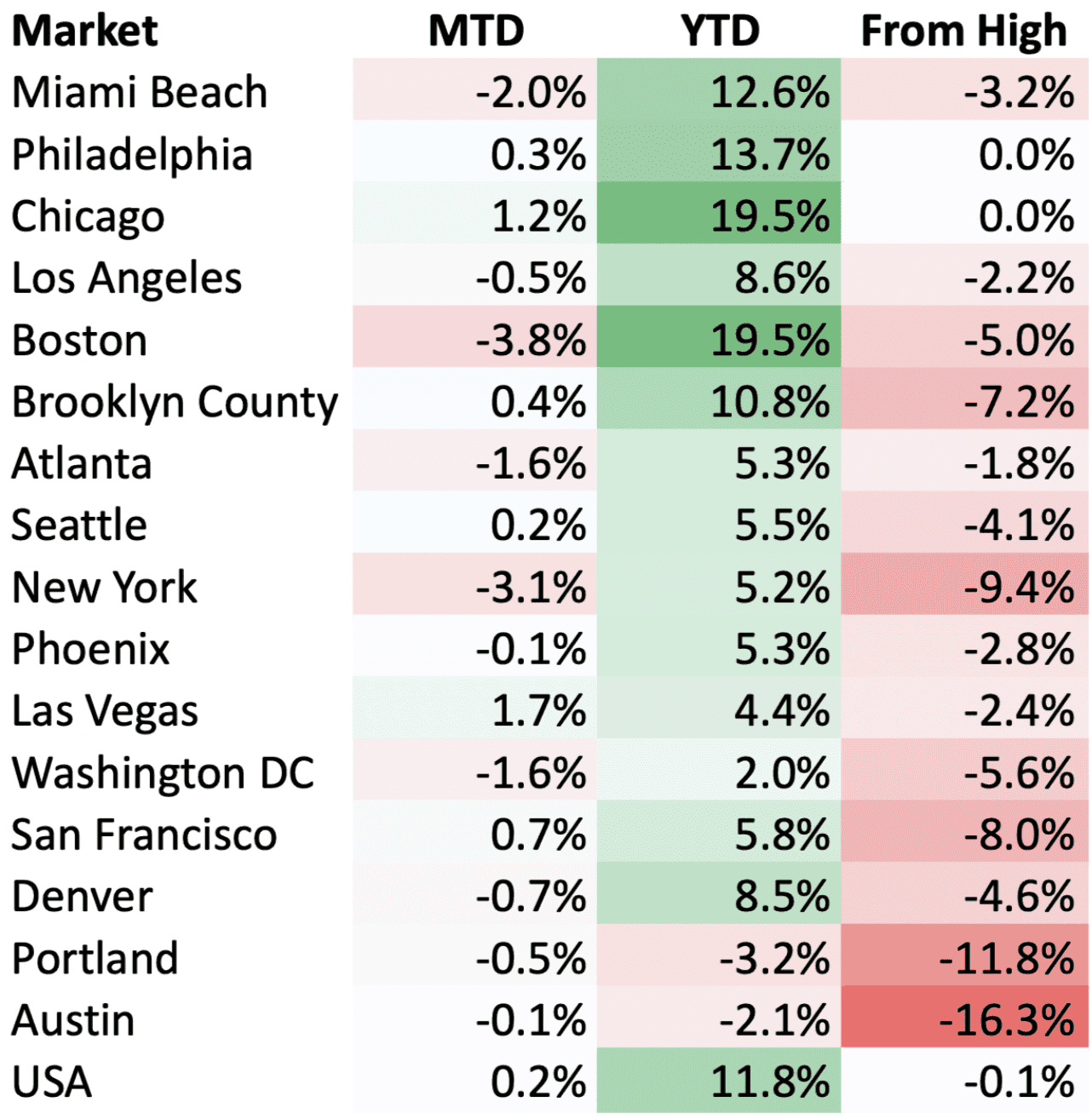 Philadelphia and Chicago remain at all time highs, while the USA price feed is just 0.1% off its all time high, set in July 2022. Four markets remain well off their all time highs: Austin (-16.3% from ATH), Portland (-11.8%), New York (-9.4%) and Brooklyn (-7.2%).