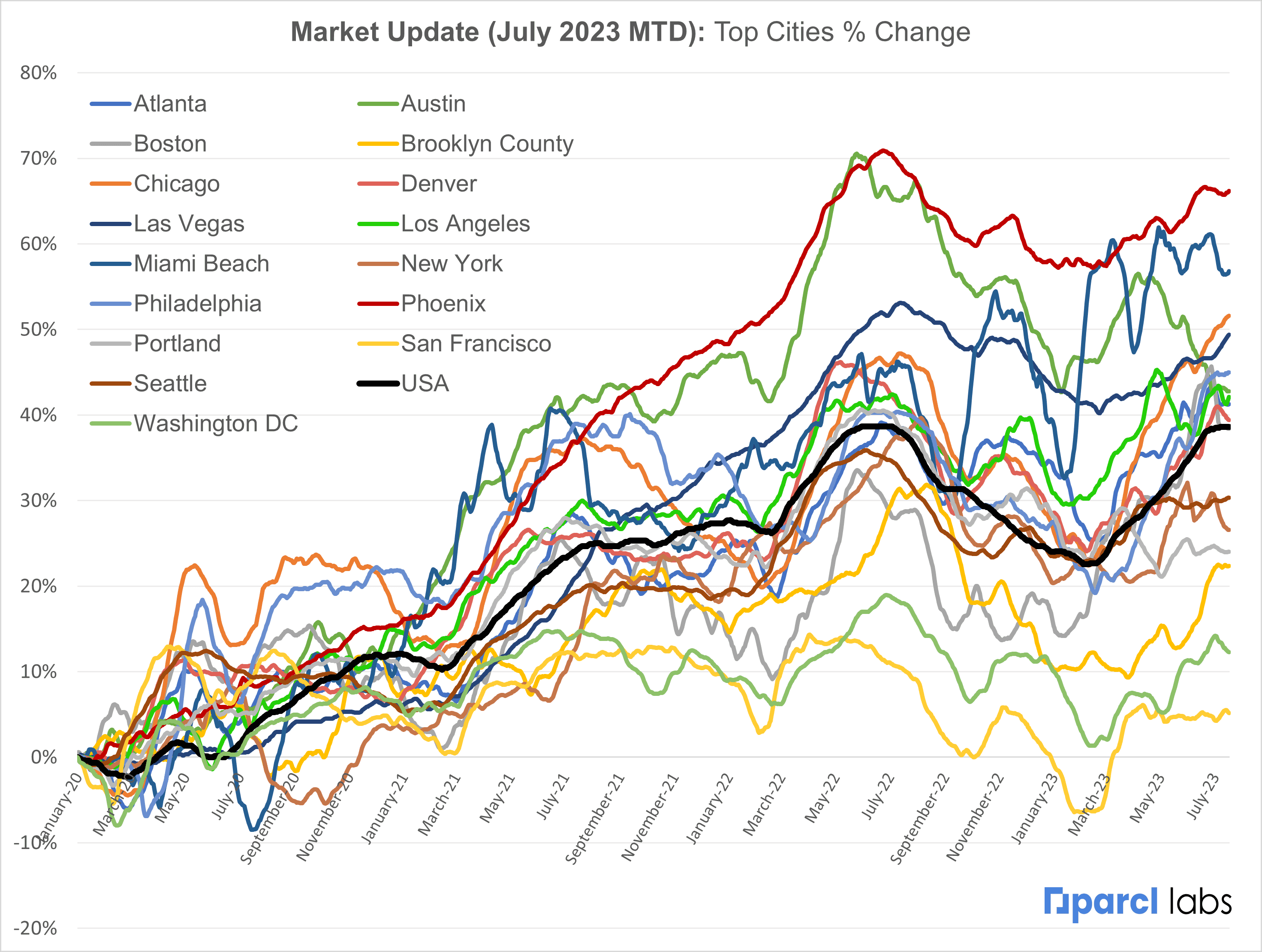 Laggards are East Coast stalwarts Boston (-3.8% MTD), New York (-3.1%) as well as Miami Beach (-2.0%). Boston was a top performing market in June (+5.6%) and tied with Chicago for the top performing market YTD (+19.5%). New York is about average, though still below USA (+11.8%). Miami Beach remains in the top third in YTD performance at +12.6%.