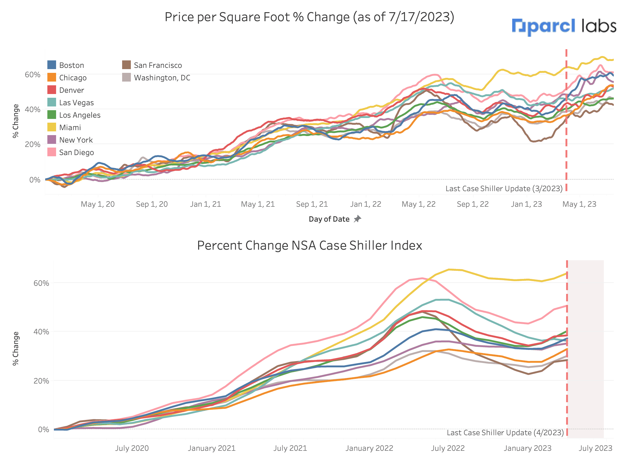 The Case Shiller updated with May data on Tuesday 6/27, showing a continued recovery in prices across all major markets. Real time data from Parcl Labs picked this up as it was happening, and, in the nearly two months since, show a continued but slowing recovery, with many markets up low/mid single digit percent from their end-May marks. This recovery may be nearing a pause or reversal, however, if July MTD performance is any indication. July also marks the tail end of the seasonal outperformance typically seen in many north/northeast markets.