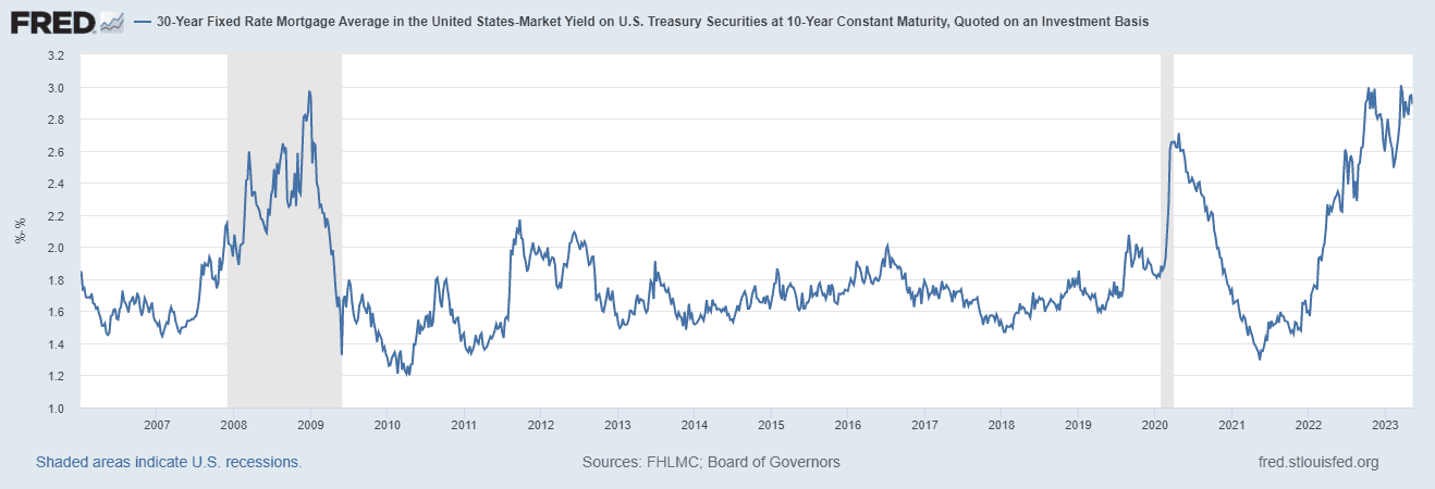 The spread between 30 year mortgage rates and the 10 year U.S. Treasury yield remains historically wide. Should this spread mean revert somewhat, and the 10y Treasury remains unchanged or continues to decline, this could perhaps create an additional tailwind for residential real estate demand near term. Important to note, the magnitude is diminished when adjusting for the effects of duration relative to the treasury yield curve.