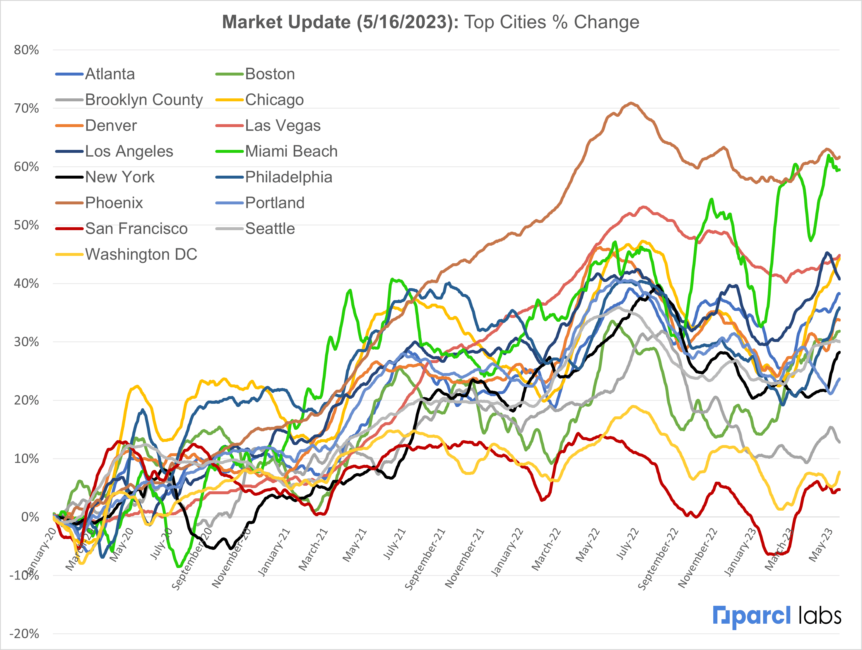 Some markets - such as New York (+4.2% MTD, +6.5% YTD, down 8.2% from peak), Philadelphia (+3.8%, +6.5%, -3.2%), and Denver (+3.3%, +4.1%, -8.5%) - have risen at a more significant pace. Laggards are April winners Los Angeles (-2.9%, +7.6%, -3.1%), Brooklyn (-1.9%, +2.2%, -14.4%), and Miami Beach (-1.3%, +14.5%, -1.5%); all are down MTD.