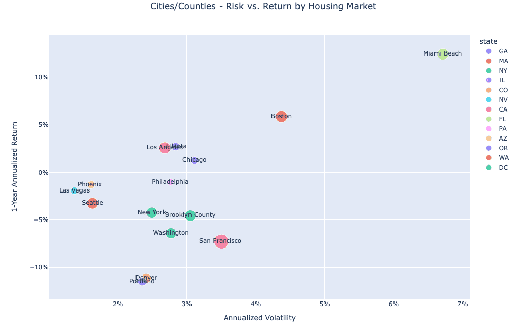 Miami Beach and Boston continue to screen as top performers on a risk-adjusted basis. Portland and Denver screen as the worst performers.