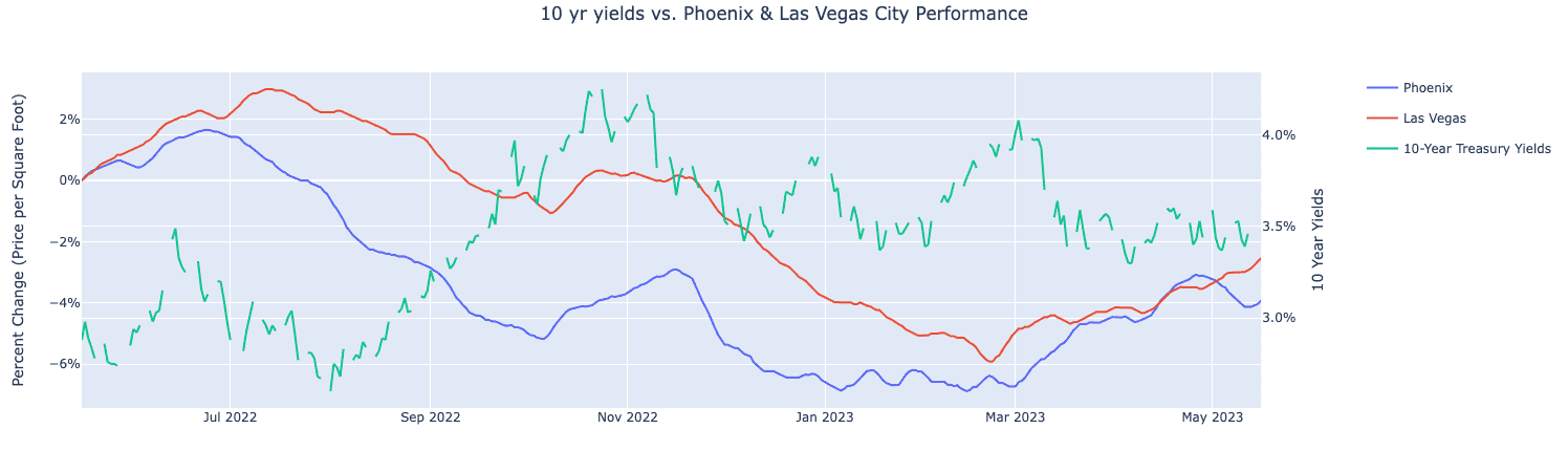 On the other hand treasury yields continue to exhibit elevated realized volatility, which has an impact on myriad downstream elements, such as mortgage rates and demand for housing. Phoenix and Las Vegas are two regional US real estate markets that exhibit among the highest negative correlations to real time changes in interest rates.