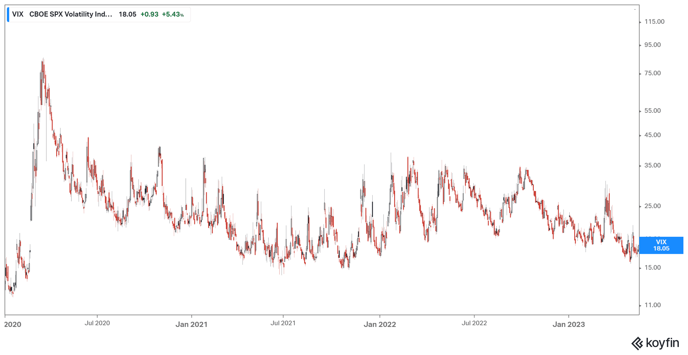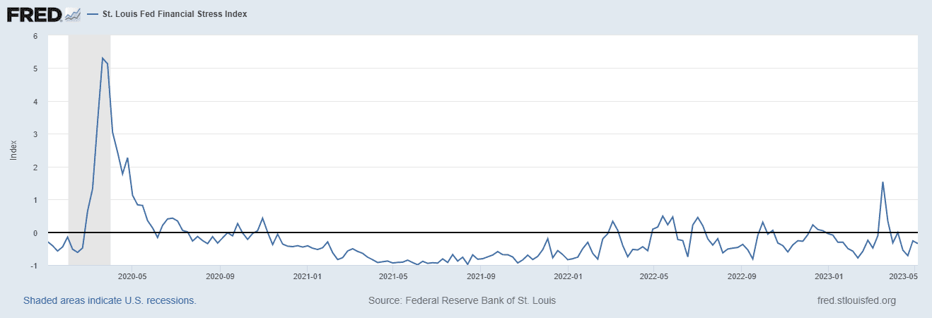 Volatility across markets remains relatively subdued, though up slightly week over week, after a spike in March around bank solvency concerns as evidenced by the VIX Index and St. Louis Fed Financial Stress Index (shown below). This has led to a stabilization in risk appetite, though both treasury yields and equity markets remain approximately flat over the trailing 30 days.
