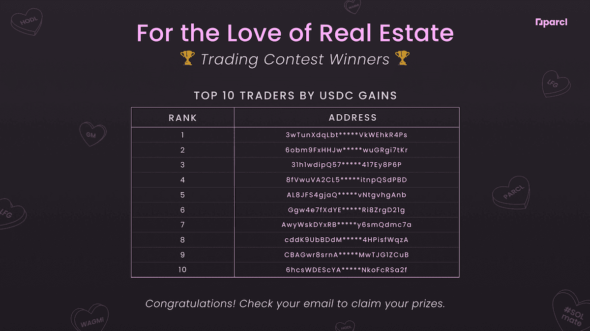Between Feb 14- March 3rd Pacl traders around the world participated in the #ForTheLovoeofRealEstate trading contest. While competition was close, there were 10 lucky winners who split a prize pool of $500 in liquidity tokens, and the top three traders also won NFTs from projects such as Famous Fox Federation, Catalina Whale Mixer, and Orcanauts.