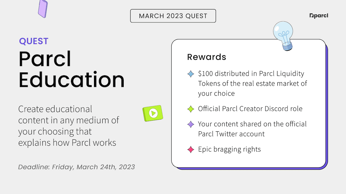 Showcase your talents by creating educational + engaging content for the Parcl community. Join the Parcl Discord for additional details on how to participate and begin your first quest.