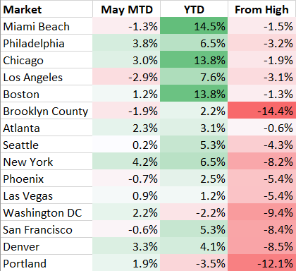 Some markets - such as New York (+4.2% MTD, +6.5% YTD, down 8.2% from peak), Philadelphia (+3.8%, +6.5%, -3.2%), and Denver (+3.3%, +4.1%, -8.5%) - have risen at a more significant pace. Laggards are April winners Los Angeles (-2.9%, +7.6%, -3.1%), Brooklyn (-1.9%, +2.2%, -14.4%), and Miami Beach (-1.3%, +14.5%, -1.5%); all are down MTD.